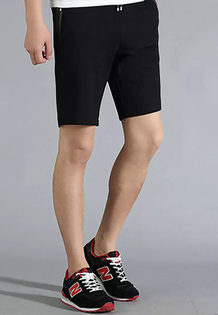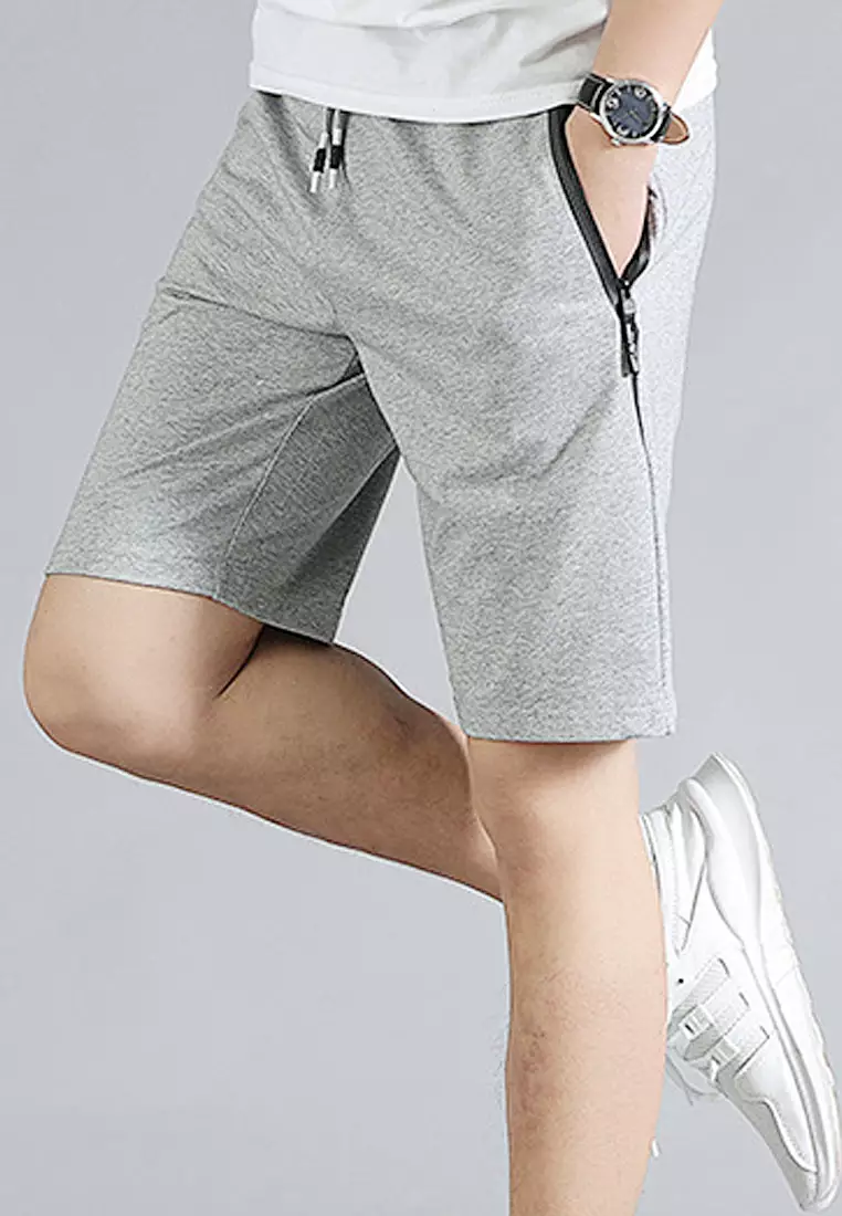 Men’s sweat short elasitc waistband and external string front zipper pockets with zipper puller